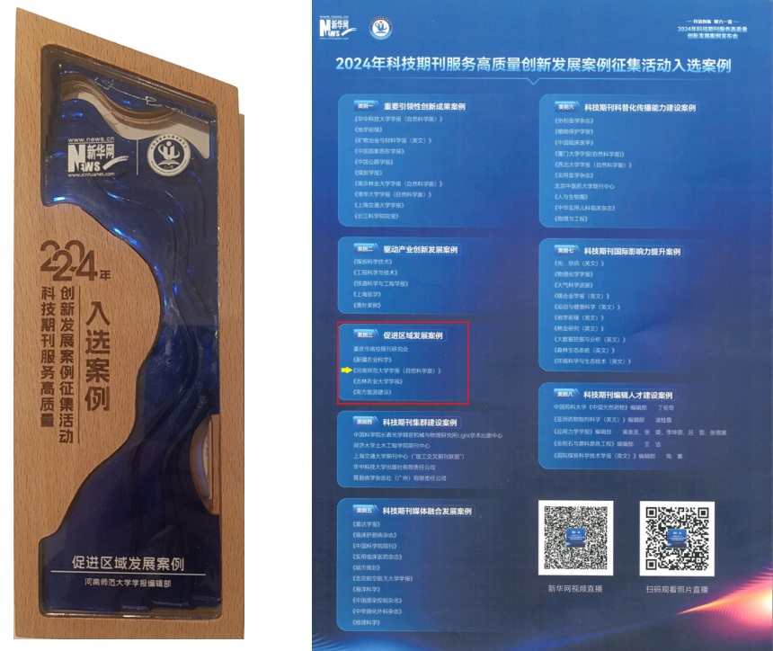 12月26日,由新华网、中国高校科技期刊研究会主办的“开放创新,聚力一流:2024年科技期刊服务高质量创新发展案例发布会”在北京召开,我校学报自然科学版申报的案例《聚焦河南地方小区域刊发“两高一全”大文章》入选“促进区域发展案例”。