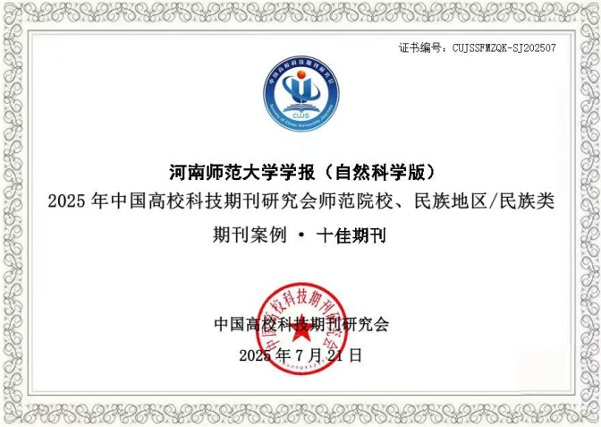 7月20至24日,中国高校科技期刊研究会师范院校期刊专业委员会、民族期刊专业委员会2025年学术年会在乌鲁木齐市召开。会上公布了2025年师范院校、民族地区/民族类高校科技期刊优秀案例、“师范·民族”期刊专项基金、编辑学论文征文评选结果,我校学报自然科学版入选“2025年师范民族院校科技期刊优秀案例·十佳期刊”,刘洋副编审荣获“师范民族院校科技期刊青年编辑编校技能展示活动优秀青年编辑”。