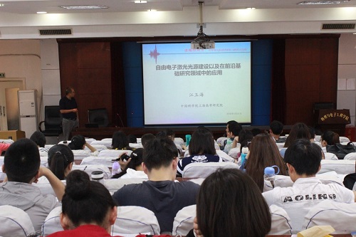 江玉海作了题为“自由电子激光光源建设以及在前沿基础研究领域中的应用”的报告,其就自由电子激光光源建设原理、研究现状和应用前景等方面介绍了这一前沿技术,并向与会人员介绍了中科院上海研究所的相关情况。在提问环节,江玉海研究员详细回答了同学们提出的关于自由电子激光和中科院研究生招生的相关问题。