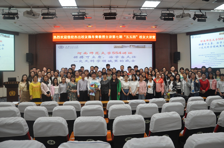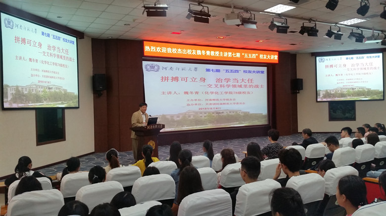 魏冬青以“拼搏可立身,治学当大任”为主题,从自己的成长背景、求学历程和科学研究等三个方面给同学们做了一场精彩的报告。他深情的回忆了自己的母亲以及恩师卢锦梭对自己成长、成才的关爱与影响,讲述了自己与家人、母校、恩师、家乡的故事,介绍了自己以恩师命名设置“卢锦梭奖学金” 十多年来回馈母校心路历程。魏冬青说,一个学校要靠文化支撑,文化要靠大师支撑,卢锦梭就是河南师大大师级的老师,能以自己导师的名字设立奖学金,感到是一种荣耀。他要通过这种形式来感恩母校和导师的精心栽培,传播导师严谨治学和爱生如子的精神品格,激励一代代师大学子刻苦学习和努力奋斗。随后,他又着重介绍了自己如何连续跳级(高一考上大学,大三考上研究生,博士两年毕业),如何在化学、物理学、统计学、计算机科学和生物学交叉领域里成功实现跨界,并在铁电液晶、分子液体转动动力学、花椒素抗衰老作用等方面取得不俗学术研究成就的事迹,以此激励同学们要树立远大的理想和追求,要努力奋斗和拼搏,要积极探索,敢于创新。只要努力,河南师大培养的学生完全可以成为一流的人才。