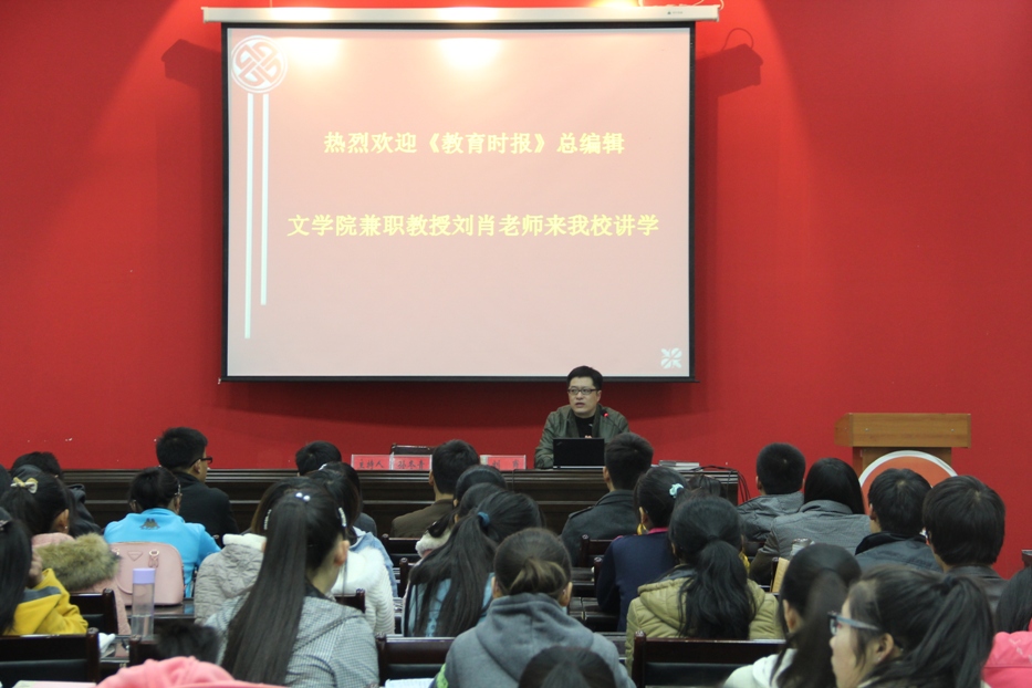 11月15日晚,我校校友、文学院91届毕业生,现任《教育时报》总编辑、文学院兼职教授刘肖老师应邀在我校文学院报告厅作了主题为“让文学成为人生底色”的报告会,文学院党委副书记孙冬青出席了本次讲座,文学院2013级100余名学生聆听了本次讲座。 刘肖老师为我校跋涉文学社的创始人,恰逢跋涉文学社成立25周年之际,刘肖老师重返母校为大家进行了一场精彩的讲学。刘肖老师以提问的方式了解了在座同学的人生规划,并为大家解答大学四年应如何更好的规划。刘肖老师在高考时遇到变故两次落榜,但仍坚持不屈不饶的努力,其人生历程给予了同学们启发与鼓舞。关于选择专业、考研与就业的问题,刘肖老师希望同学们遵循自身兴趣、坚持自我理想,建议大家要“努力让未来的自己生活在曾经的理想之中”。谈到文学,刘老师希望大家都能保持这份不功利的爱好,发挥文学真正的价值,让文学成为人生底色。最后,刘肖老师同大家进行了交流和讨论,针对大家提出的问题给予了耐心细致的解答,令在场师生受益匪浅。 刘肖老师在此次讲学中为大家全面分析了文学、兴趣与理想等方面的问题,使大家进一步培养了对文学的兴趣、也明晰了大学生活的方向,对同学们人生信念的树立和人生道路的选择都有着重要的指导作用。 (文学院 张 蒙 王天宇)