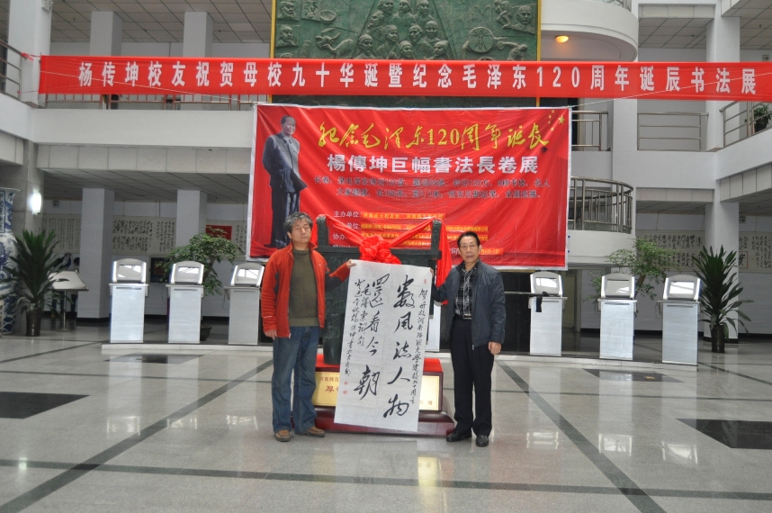 日前,我校校友杨传坤教授莅临我校,祝贺我校90华诞,举行“祝贺母校九十华诞暨纪念毛泽东120周年诞辰书法展”,并向图书馆捐赠了多幅书画作品。 11月8日上午,图书馆党政负责人与杨传坤教授进行会谈,欢迎杨传坤教授的到来。苏全有馆长介绍了近年来图书馆工作和发展情况,对杨传坤教授关心母校发展表示感谢。杨传坤教授深深感谢母校的培养,并谦虚的表示愿为母校的发展和文化建设尽绵薄之力。杨传坤教授向我校捐赠了《数风流人物还看今朝》等个人书画作品,苏全有馆长向他颁发了捐赠荣誉证书。 今年是毛泽东同志诞辰120周年,杨传坤校友,精心创作了《纪念毛泽东120周年诞辰——毛泽东诗词巨幅书法长卷》。《长卷》长160M、宽1.1M,历时13个月,搜集选取毛泽东少年至终年诗词120首,题词等26条,用篆、隶、楷、行、草、魏碑、毛体、临书等8种书体,钤印120方。《长卷》全面展示了毛泽东的人格、思想、诗词、书法等面貌,通过回顾中国共产党、中国人民解放军、中华人民共和国及毛泽东思想的创建和发展历程,纪念卓越的领袖毛泽东同志,营造教育和影响公众的社会文化氛围。 杨传坤,号劲墨,中共党员,是我国著名书法家。早年毕业于伟德官网下载苹果版,现供职于郑州工业贸易学校。他还兼任河南书画专业委员会副会长、政协郑州市第十届委员、世界艺术家协会理事等学术职务。杨传坤教授笃志书道,博学广收,善写行、草,其作品结体严谨,用笔凝练,充满浓郁的书卷气息。他在郑州大学等多所大中专院校开设过书法讲座,并踊跃参加各种社会公益活动。曾获“中国当代书画艺术杰出成就奖”等数十项奖励和“中国文艺终身成就杰出艺术家”等荣誉称号,在书画界有很大影响。 (图书馆党总支 供稿)