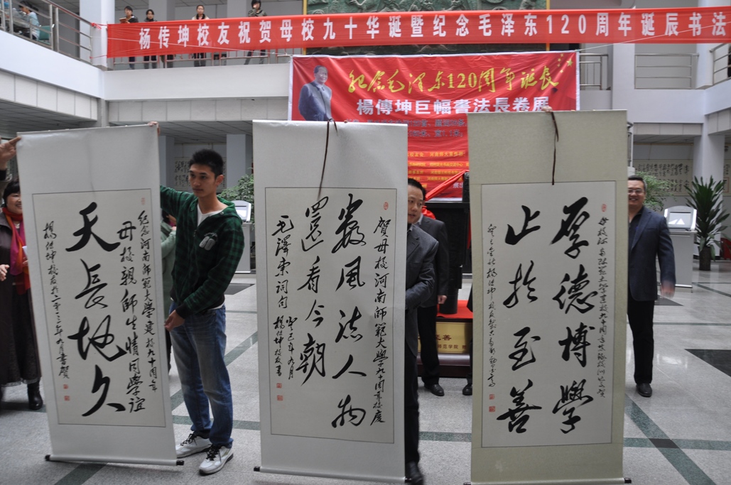 铁管劲墨手手相传,艺海扬波生生不息。11月5日,“杨传坤校友书法展”在我校图书馆举办。我校校友数学与信息科学学院76届毕业生杨传坤,校长助理朱华北,校工会、数学与信息科学学院、图书馆、校教职工书画协会、学报编辑部、宣传部相关负责人出席了书法展开幕式。开幕式由校友会办公室主任魏海琴主持。 校长助理朱华北对杨传坤校友表示诚挚的谢意,他说,伟德官网下载苹果版建校90周年恰逢毛泽东同志诞辰120周年,杨传坤校友携多年书道心血相报母校培育之恩,展现了师大校友心系母校的赤子之情和出众才华。杨传坤校友表示,40年后回到母校,深感母校变化之大,倍感母校亲切,师生情深,学友谊长。为纪念伟大领袖毛泽东120周年诞辰同时祝贺母校建校90周年,特意举办本次书法汇报展。教职工书画协会会长池月新对杨传坤校友的到来表示热列欢迎,对其作品给予了高度评价。 书法展开幕式上,校长助理朱华北代表学校接受了杨传坤校友向母校捐赠的珍贵字画。参加开幕式的各位嘉宾还进行了现场书艺交流。 (校友会办公室 田佳)