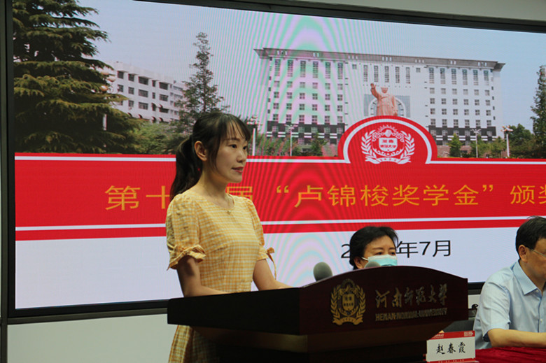 卢锦梭教育基金理事会秘书长王公轲介绍了“卢锦梭奖学金”设奖情况,以及卢锦梭教授的生平事迹、魏冬青教授的学术成就和重要贡献。我校学术委员会秘书长、卢锦梭教育基金理事会常务副理事长卓克垒宣读了第十三届“卢锦梭奖学金”获奖研究生名单。法学院研究生陶旭蕾代表获奖学生发言。与会领导向获奖的15名研究生代表颁发了荣誉证书和奖牌。
