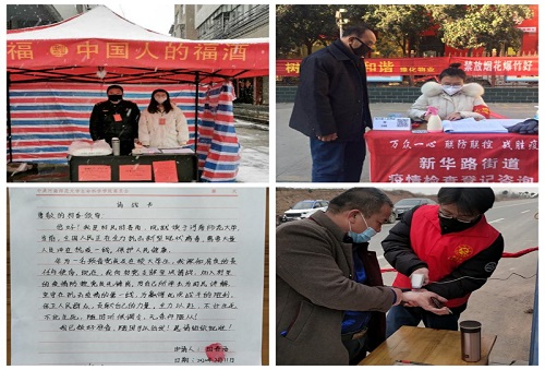 2016级生物工程专业预备党员时春雨向所在村支部提交了“请战书”,申请在疫情阻击战中贡献出自己的一份力量,2017级生物科学专业预备党员徐明真、2018级生物技术专业入党积极分子鲁展志等也主动请缨申请加入就近社区疫情防控志愿者队伍,担负起检查过往车辆、人员登记、体温测量等工作,并耐心细致地宣传疫情防控知识,为社区人员筑起疫情防控防线。虽然工作辛苦有风险,但他们表示,特殊时期,大学生党员更要力所能及地积极投身到疫情防控前线去,展现一名党员应有的责任与担当。在党组织和学生党员的影响下,2017级生态学专业学生陈杰和2018级生态学专业学生赵曙慧也主动投身到所在村和社区的疫情防控服务中,每天与巡逻队一起徒步几小时,挨家挨户进行沟通并普及宣传防控疫情的相关知识,大概率降低了新冠肺炎的传染概率。
