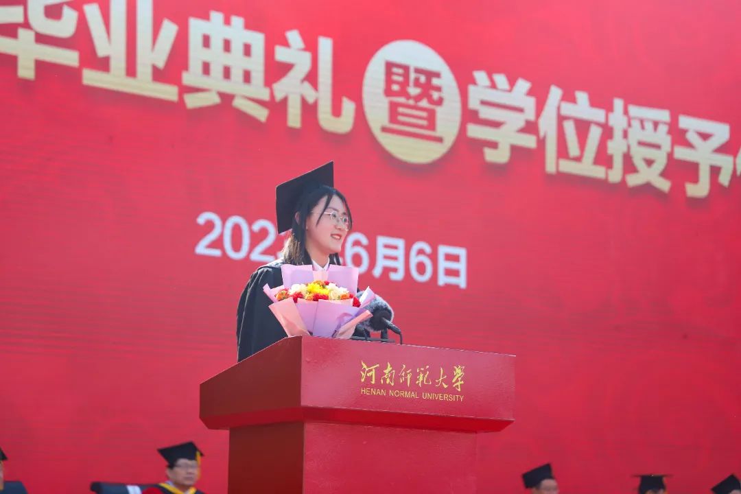 少年负壮气,奋烈自有时。研究生毕业生代表、政治与公共管理学院柴琳琳,本科毕业生代表、历史文化学院孙若曦先后发言,真诚表达了对母校和师长的感恩,共同诠释了“厚德博学、止于至善”的校训精神,愿以更加奋斗的姿态,踔厉奋发,勇毅前行,不负美好新时代,助力师大新百年!
