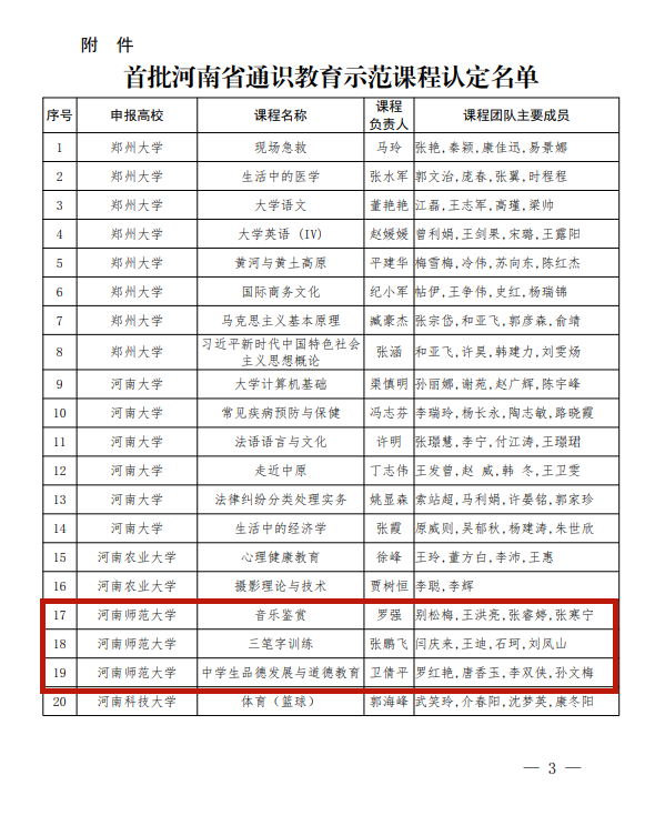 近日,省教育厅公布了首批河南省通识教育示范课程认定名单,我校三门课程榜上有名。其中,《音乐鉴赏》《三笔字训练》为公共艺术通识课程。