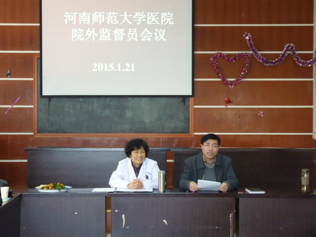 为了更好地促进医院发展、为广大师生和社区居民提供优质服务,校医院于2015年1月21日下午在五楼会议室召开了院外监督员会议。参加会议的有来自党办、校办、校纪委、校工会、研究生学院、离退休职工管理处、校团委、学生处、新联学院和附中等单位的领导、老师和学生代表。校医院院长岳桂英、副院长朱命祺、张建邦和部分科室负责人出席了会议。会议由校医院党总支书记张贺领主持。