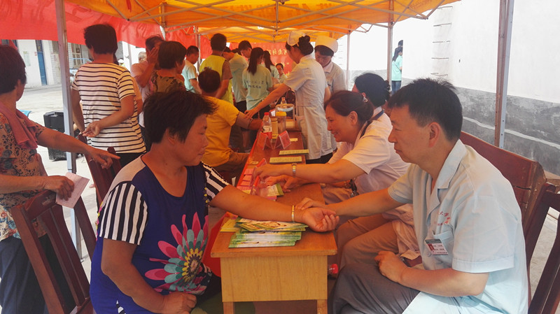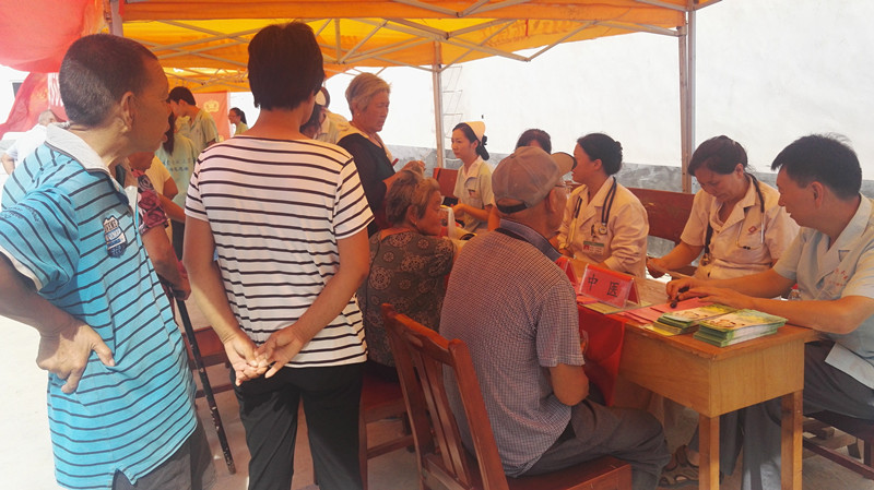 准备工作刚一就绪,闻讯而来的村民们就围了上来,他们急切地向医护人员诉说自己的病痛。医疗服务队员们很快进入工作状态,炎炎烈日,37℃的高温丝毫没有影响他们的工作。医疗服务队员耐心地解答村民的问诊咨询,讲解疾病相关防治知识,并为大家讲解定期检查身体的重要性,鼓励村民养成健康的生活习惯。中医师现场为村民做起了按摩;做心电图的老师一边为村民们测心电图,一边还耐心地给当地医务人员讲解心电图机的使用及心电图的相关知识并现场示范;随行的护士们热情地为大家测量血压、血糖和心电图。这次活动共计测血压100余人次,测血糖50余人次,测心电图30余人,约200余人次接受了医疗咨询和义诊服务,发放健康教育宣传材料300余份。