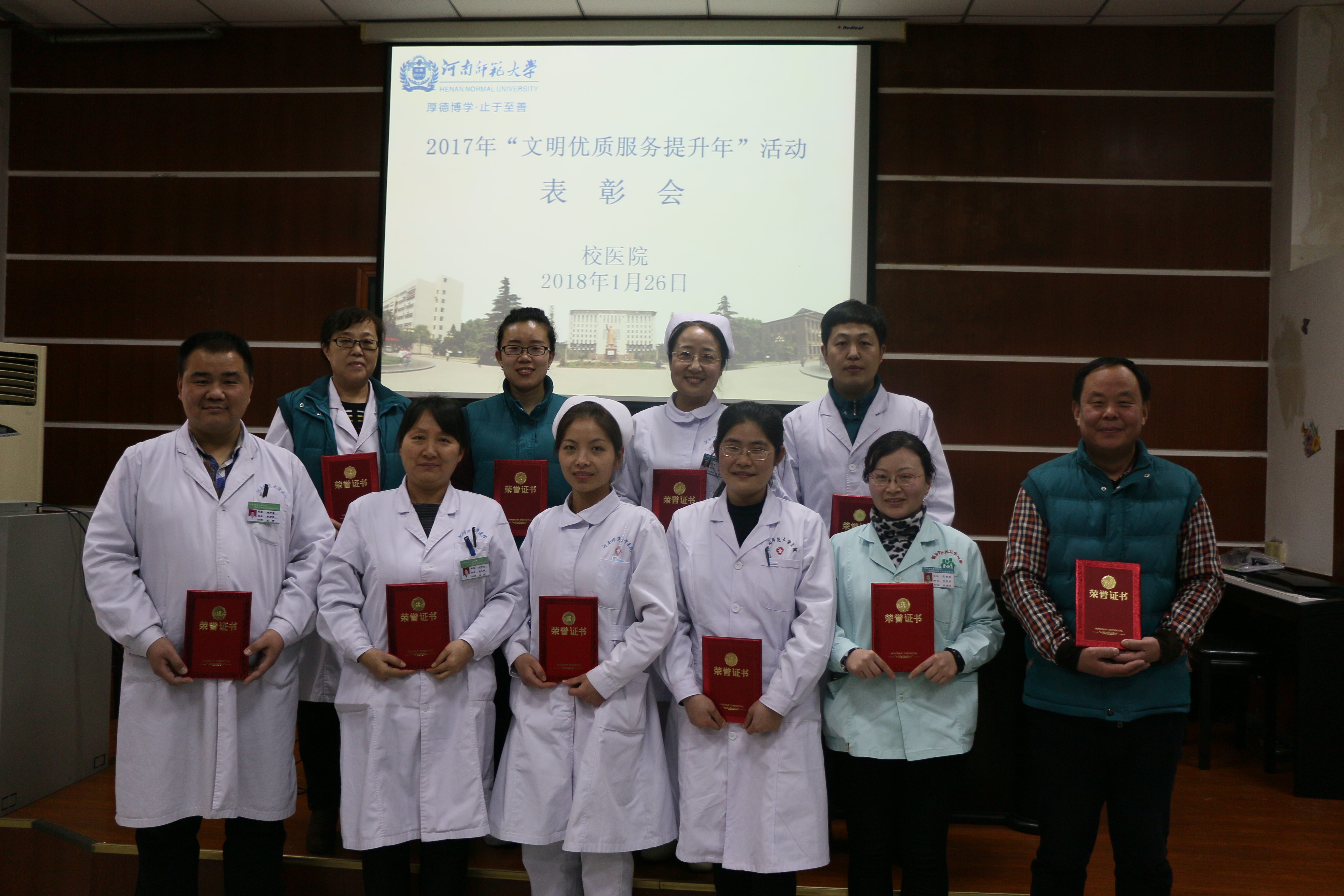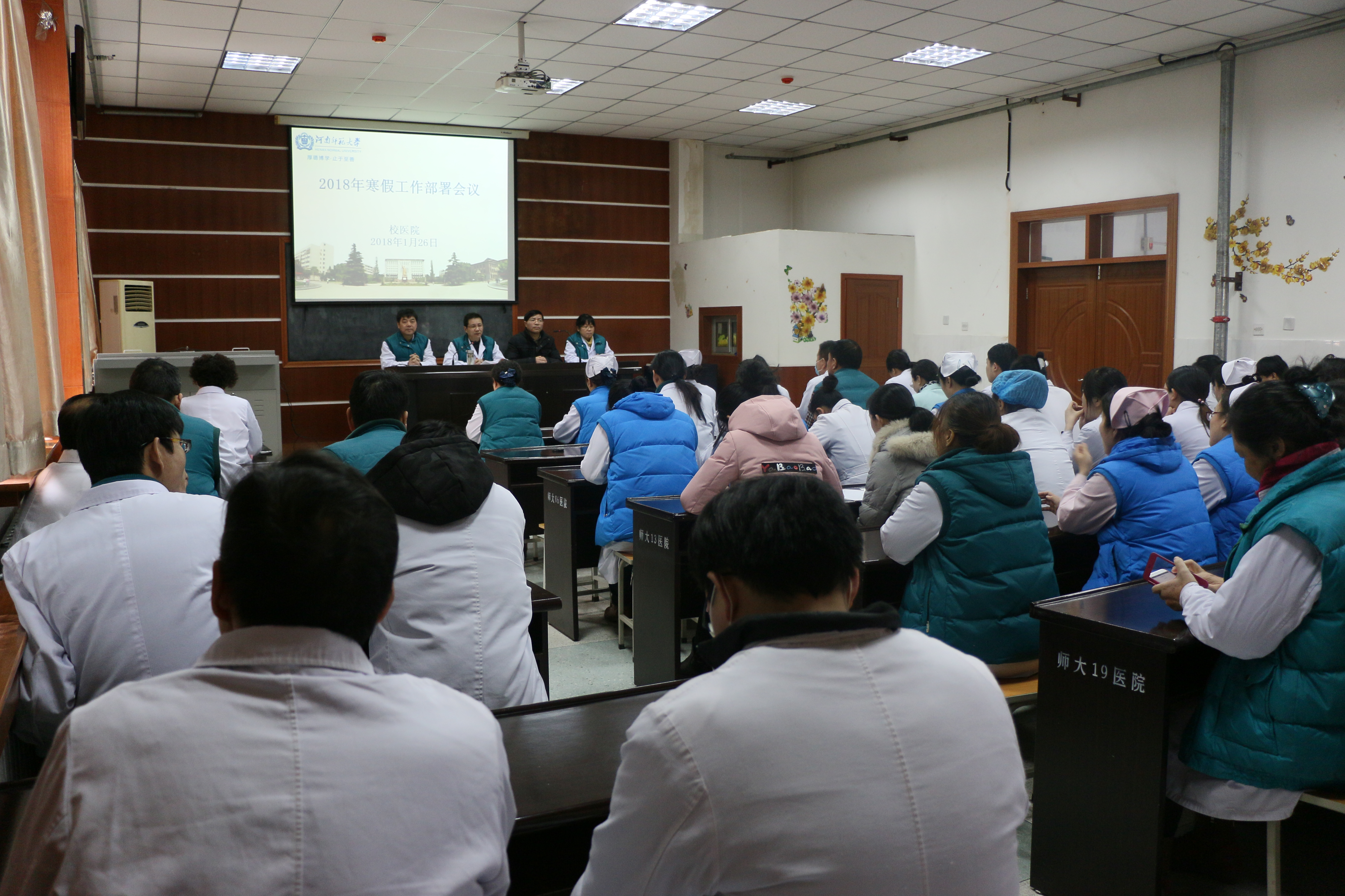 1月26日下午,校医院在医院五楼会议室召开2018年寒假工作部署会议暨2017年“文明优质服务提升年”活动表彰会。校医院负责人和全体职工参加了会议。会议由党总支书记张贺领主持。