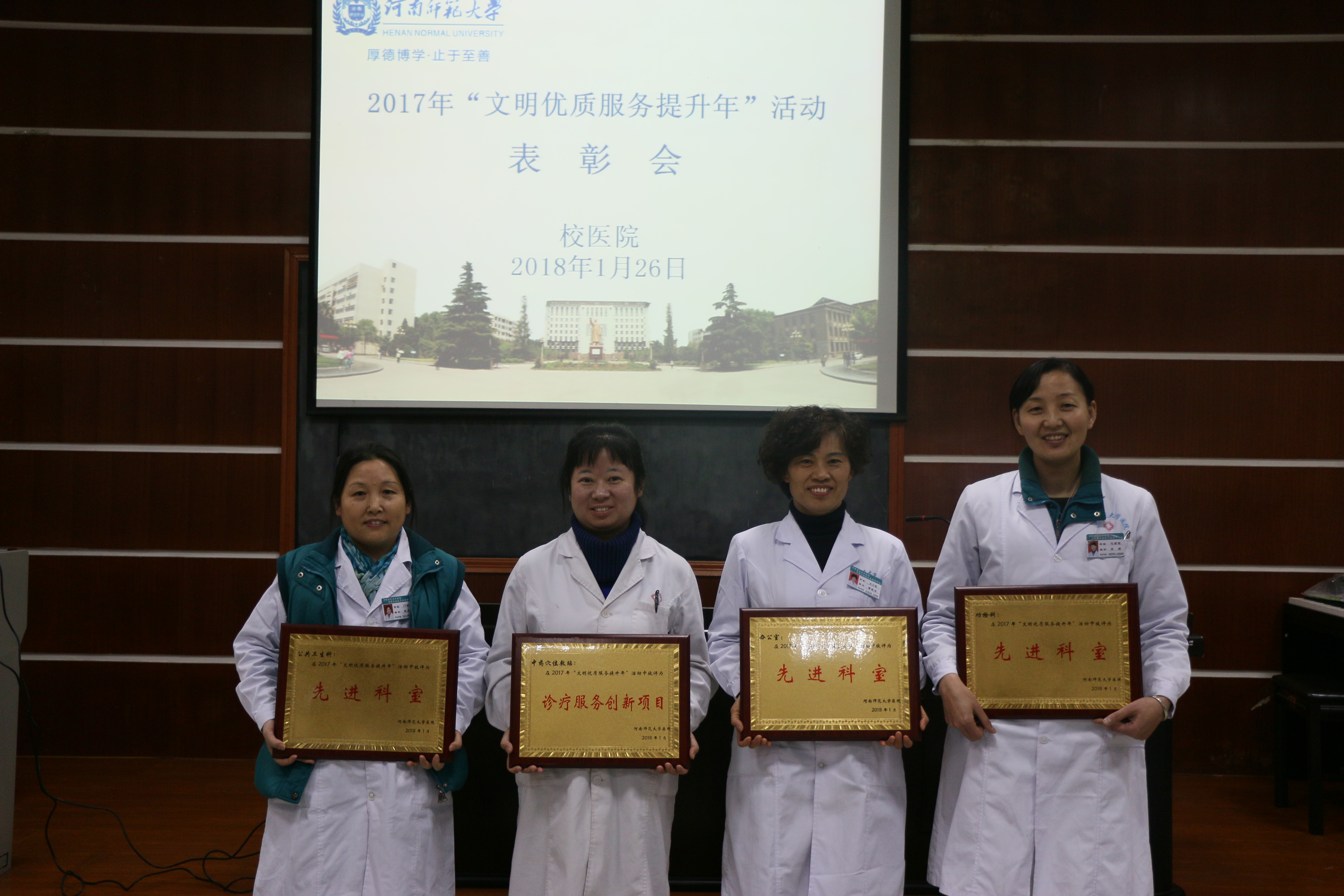 张贺领宣布了校医院2017年“文明优质服务提升年”活动中表现突出的先进科室、先进个人及优秀诊疗项目名单,院领导为先进科室和先进个人颁发了奖牌和证书。功检科科长吕岩和王莹莹医生分别代表先进科室和先进个人发言。“文明优质服务提升年”活动是校医院为贯彻落实学校《2017年工作计划要点》和《2017年精神文明建设工作计划》而开展的活动,旨在进一步增强服务意识、提高医疗水平。