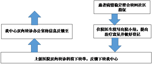 2.下转流程:上级医院接诊医生根据病人情况进行门诊或住院治疗,待病人病情稳定符合转回社区的指征时,由门诊或住院医生通过转诊平台或双向转诊办公室,将转回社区的病人信息与我院双向转诊办公室对接,经我院双向转诊办公室转入我科室治疗。