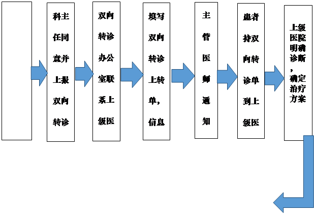 1.上转流程:对符合上转指征需转至上级医院进一步诊治的非急诊患者,由主管医师提出申请,经科主任同意后,经社区卫生服务中心双向转诊办公室联系上级医院,办理转诊手续。对于急诊患者需转上级医院的患者,可直接通过120转诊,一周内补齐相关手续。