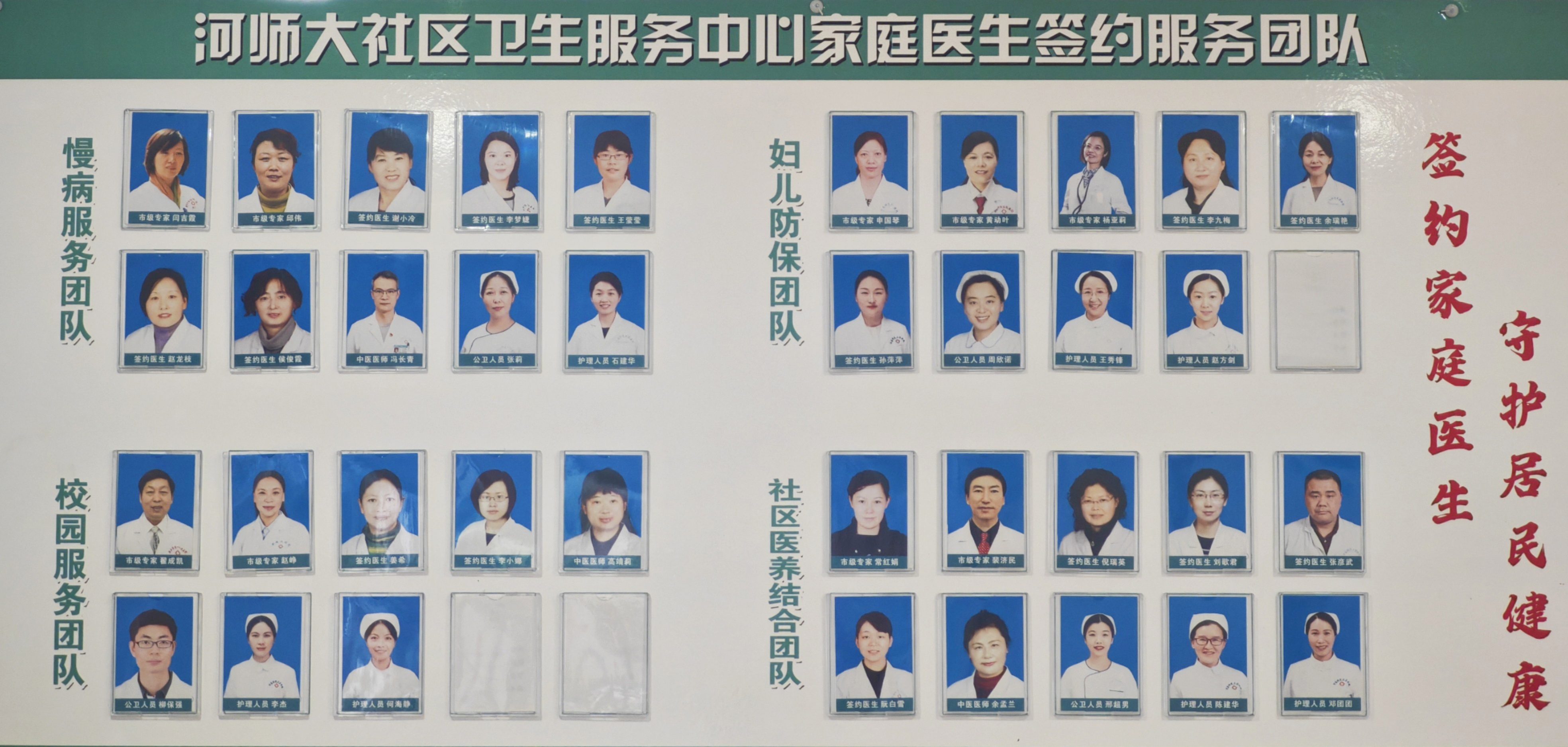 河师大社区卫生服务中心作为新乡市家庭医生签约服务试点单位,现有4个家庭医生签约服务团队。每个团队均配备1-2名三甲医院主任医师,每个团队均包含全科医师、专科医师、中医师、公卫人员、护理人员,以保证团队工作有序开展。