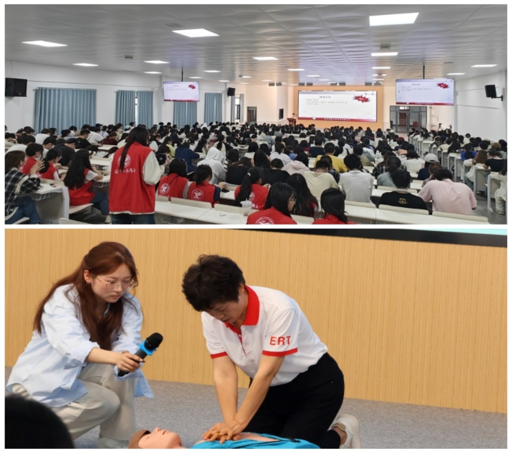曹老师结合案例强调了普及心肺复苏术的重要性,以生动形象的视频对心肺复苏的基本流程、步骤、操作要点以及AED的应用进行深入浅出、认真细致地讲解,并借助心肺复苏模拟人进行操作示范,邀请在场学生进行现场实操,同时给予耐心指导和纠正,让学生真正能够学以致用,受到了与会学生的广泛好评和欢迎。