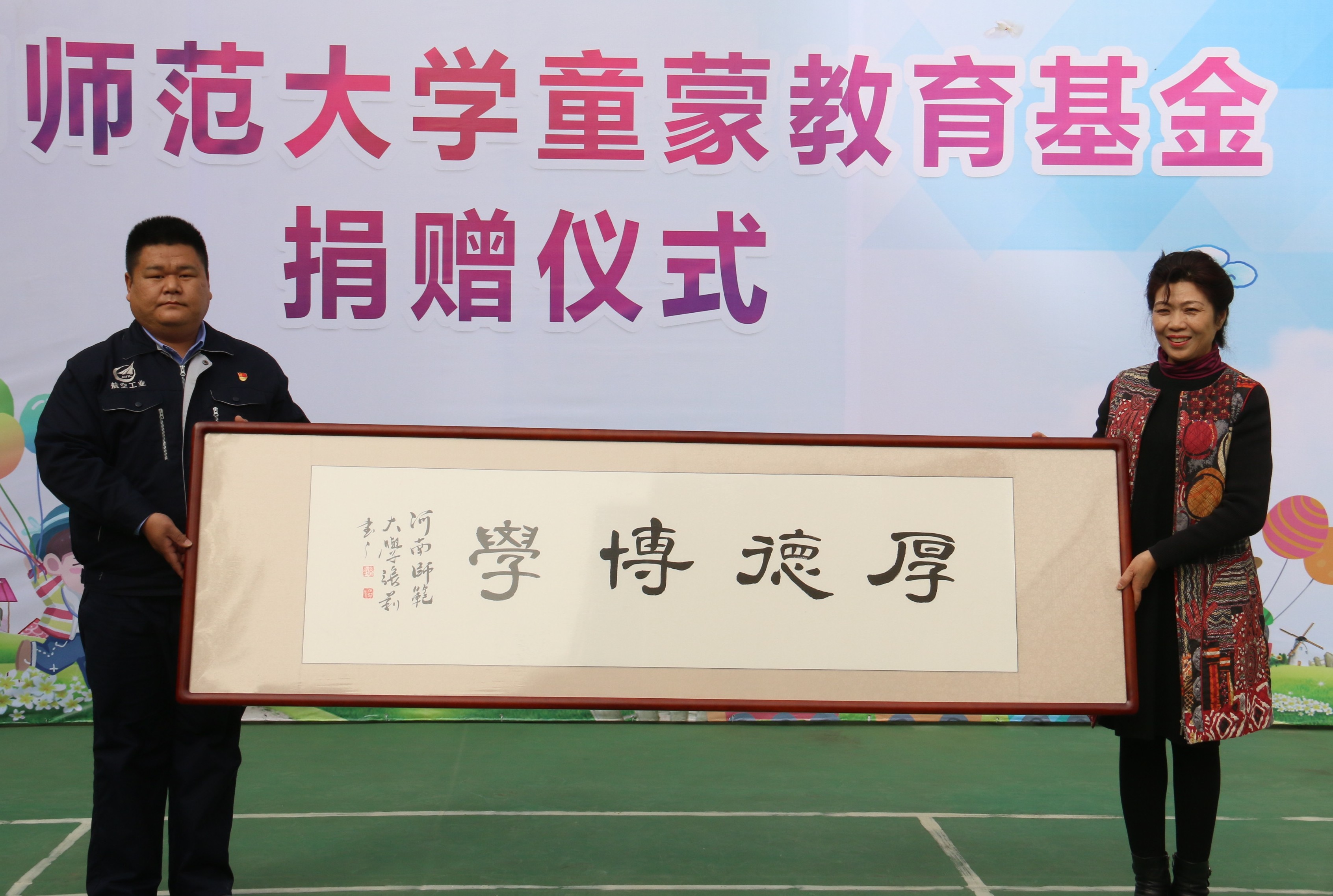 仪式上,学校教育发展基金会理事长魏海琴与“好人小分队”代表、文学院2013届校友、河南山河文化传播有限公司总经理黄宇一签订捐赠协议书;李学志代表学校接受“好人小分队”代表赵莉莉校友的捐赠,并颁发捐赠证书;张莉向“好人小分队”代表、“省五一劳动奖章获得者”牛广光赠送“厚德博学”书法纪念牌匾;校党委研工部部长许天心代表幼儿家长发言;幼儿园幼儿代表向“好人小分队”代表献花。