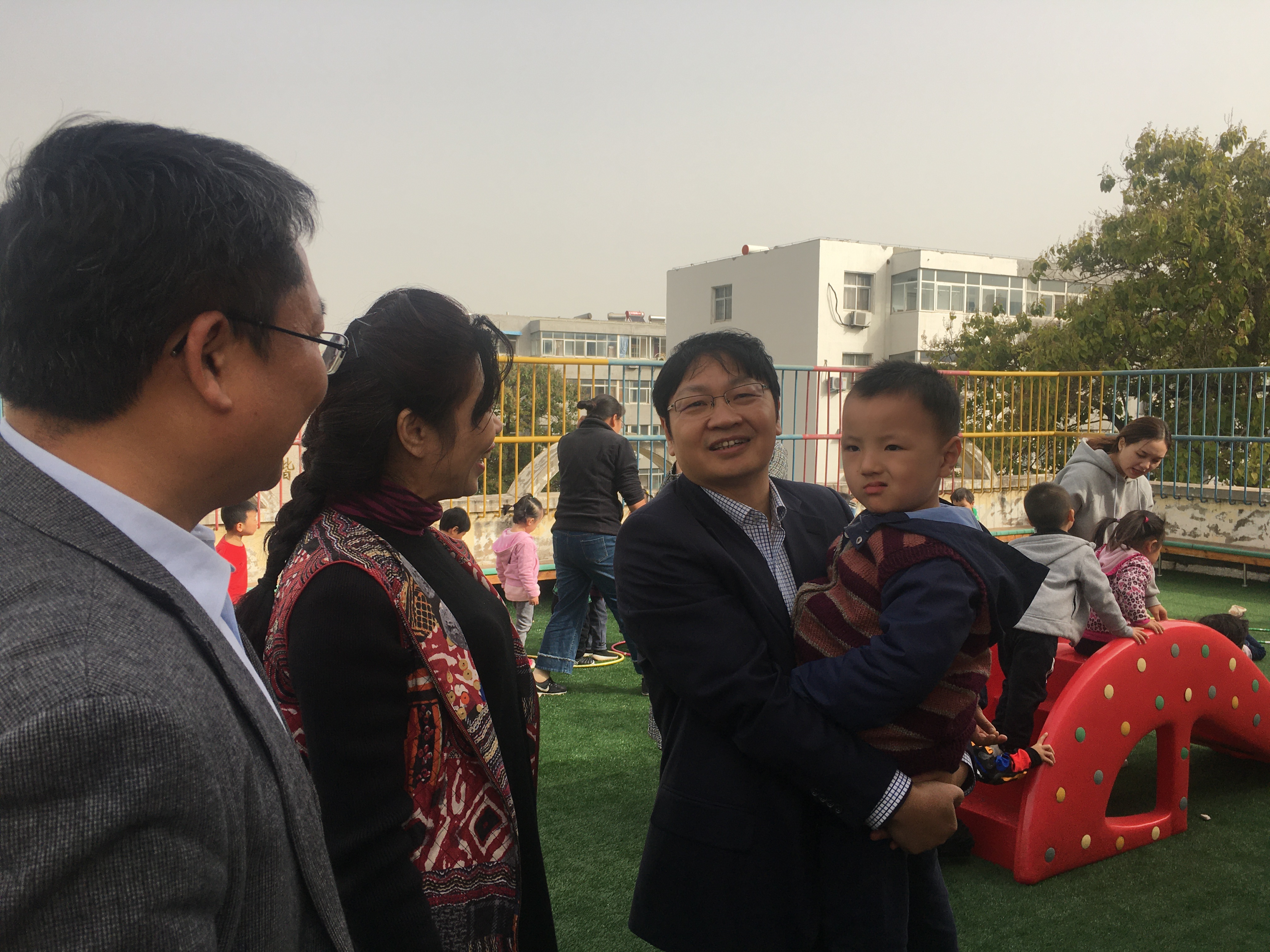 李校长登上四楼平台,实地查看了草坪铺设效果,关切的问是否环保,一定要为孩子们提供安全环保的材料。李校长充分肯定了幼儿园班子的工作,管理到位,安全意识强,各项工作落实及时有效。李校长来到孩子们中间,抱起孩子亲切的和他聊天,慈祥和蔼的笑容感染者在场的每一个人。