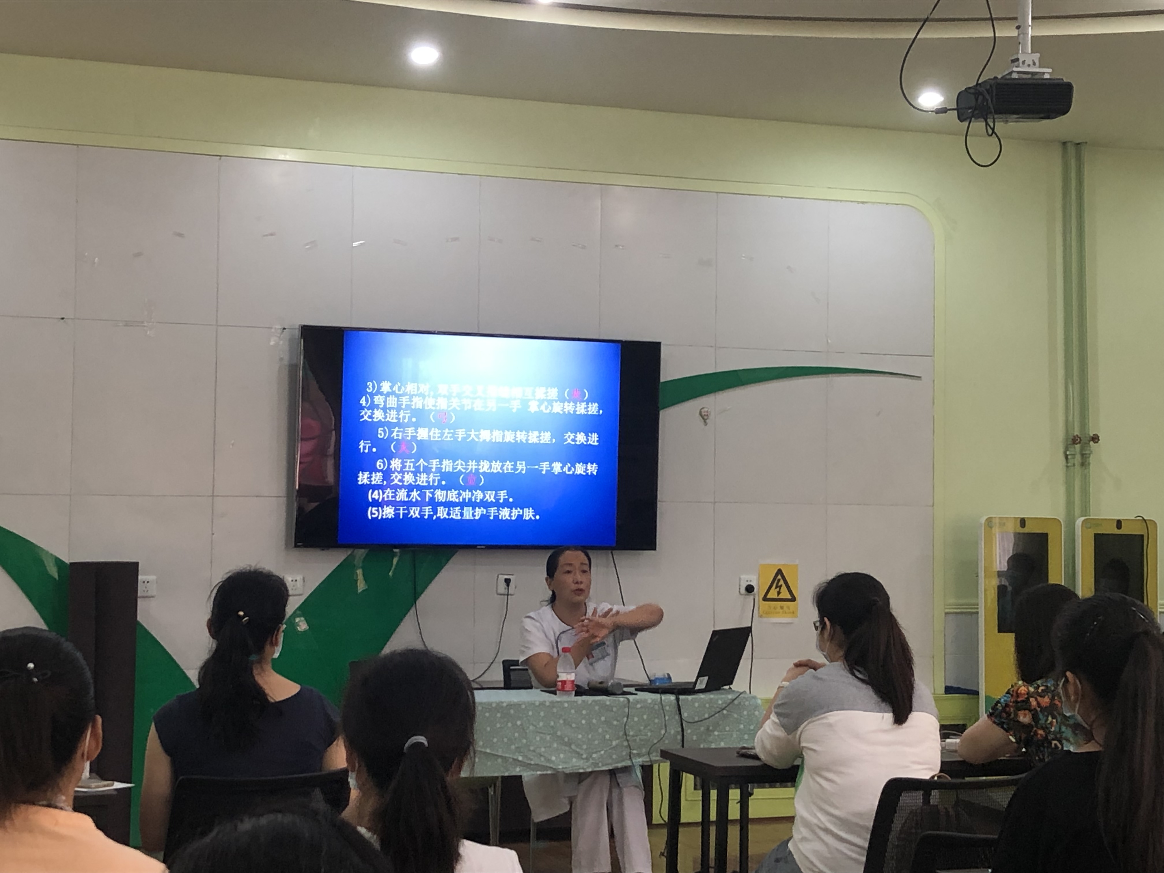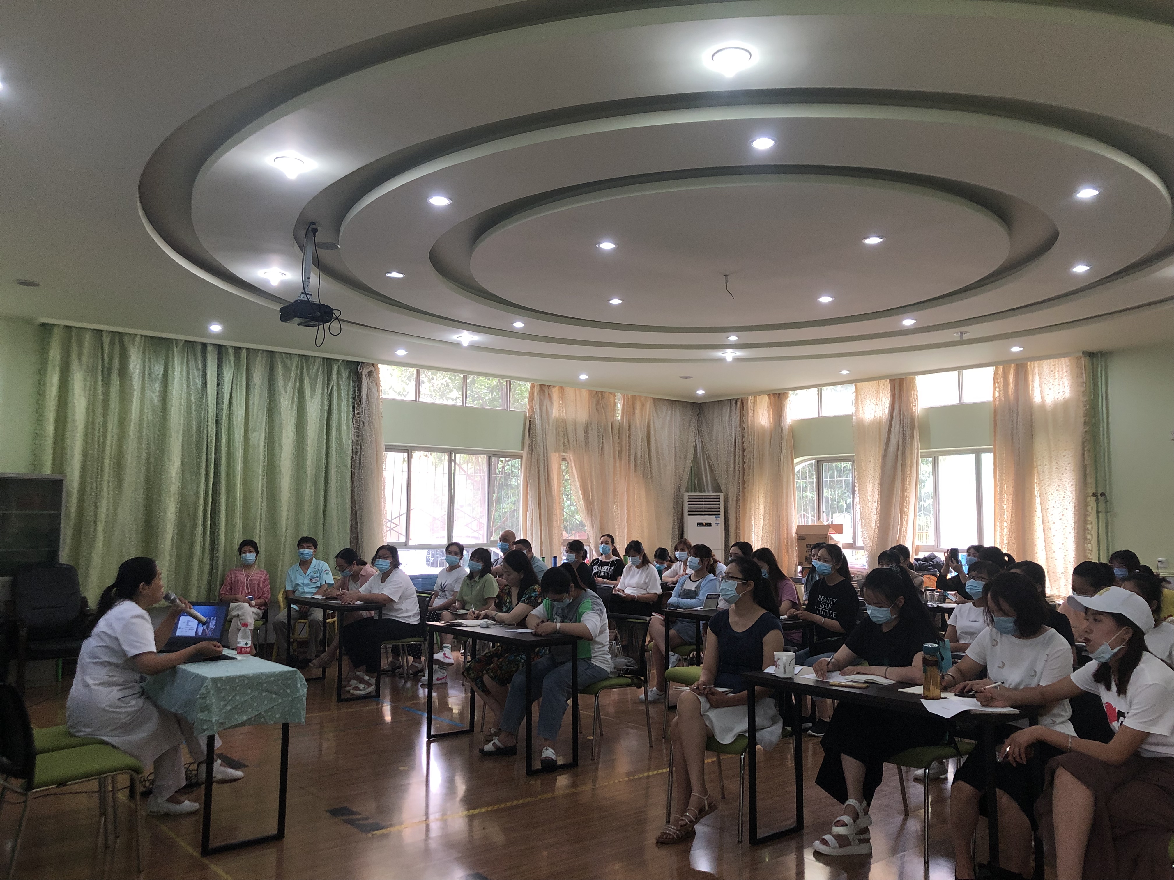 培训过程中,田护士长细致全面地为大家讲解了幼儿园一日生活工作流程的重点环节管控措施,正确洗手、佩戴口罩方法,环境及物体表面的消毒方法及注意事项等。本次开学疫情防控培训内容详实具体,科学清晰,全体教职工认真学习、静心聆听,并做好笔记。