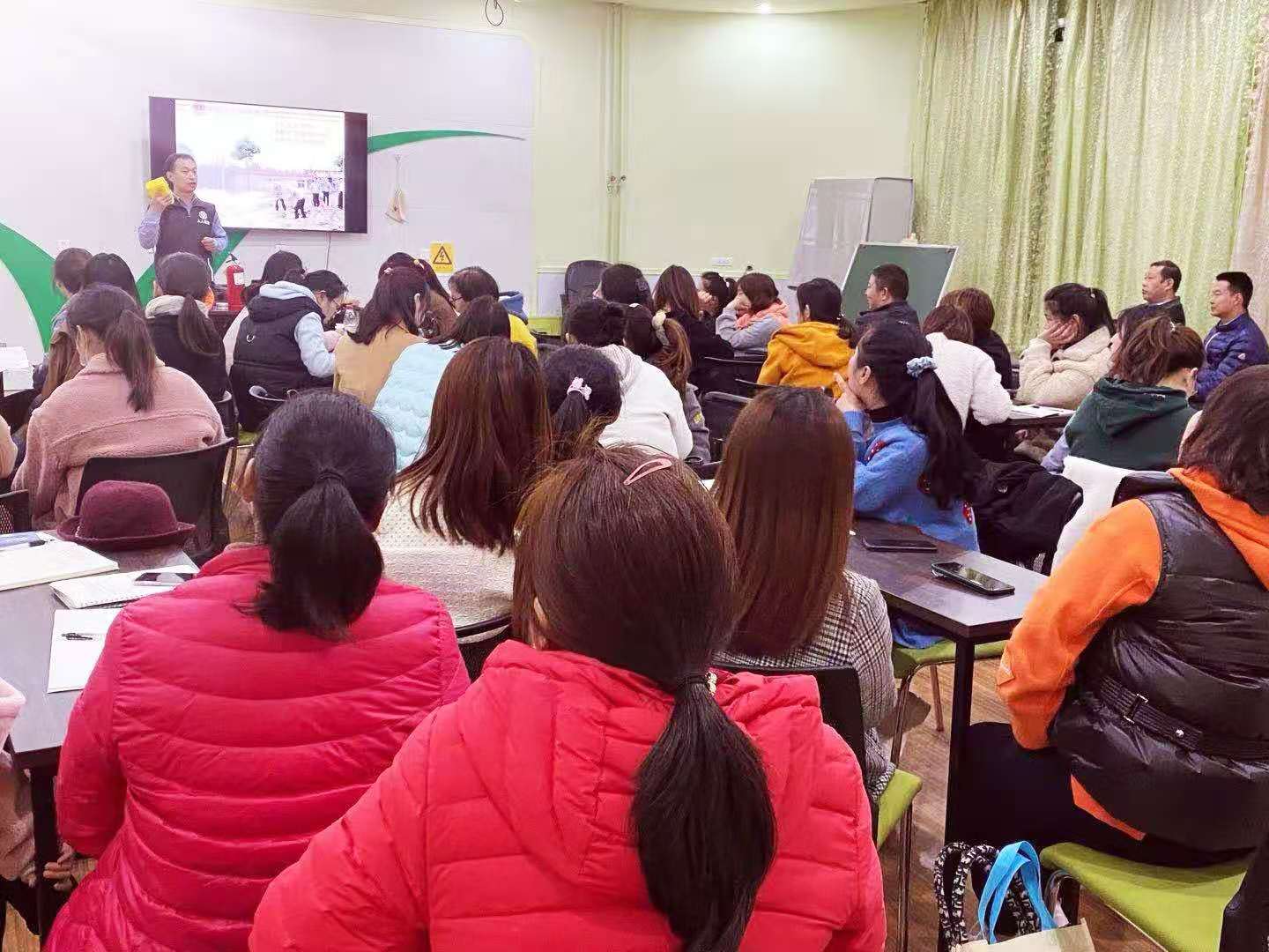 程科长在培训会上做了重要讲话,对幼儿园消防逃生工具的配备和幼儿园消防工作的支持配合做了部署和安排。尹教官从火灾发生的类型,易发生火灾的时间及火灾发生原因,如何快速发现火灾,再结合案例分析,详细讲解了消防逃生的方法及消防逃生工具的正确使用,最后着重讲解了幼儿园火灾疏散逃生的要求。