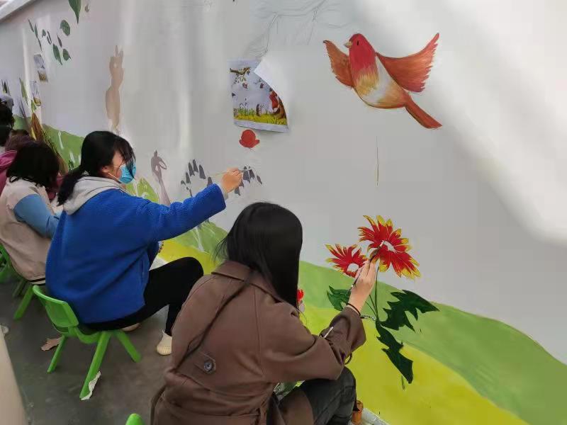 为进一步美化幼儿园办园环境,营造和谐温馨氛围,美术学院“艺心向党”党员志愿服务队受邀组织二十名学生志愿者,于2月25日为我校幼儿园绘制一面大型墙体彩绘。