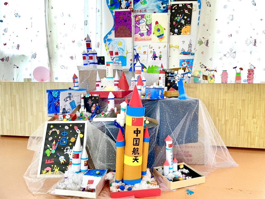 DIY手工作品《彩绘野餐垫》、《草帽》,让孩子们充分发挥想象,自己动手设计出自己心目中的作品;航天手工制作《火箭》、《小小宇航员》、《中国航天》等作品栩栩如生、气势磅礴;反映抗疫的绘画作品《消灭病毒》、《抗疫口罩》表达了孩子们对奋战在一线的医护人员的敬佩之情。