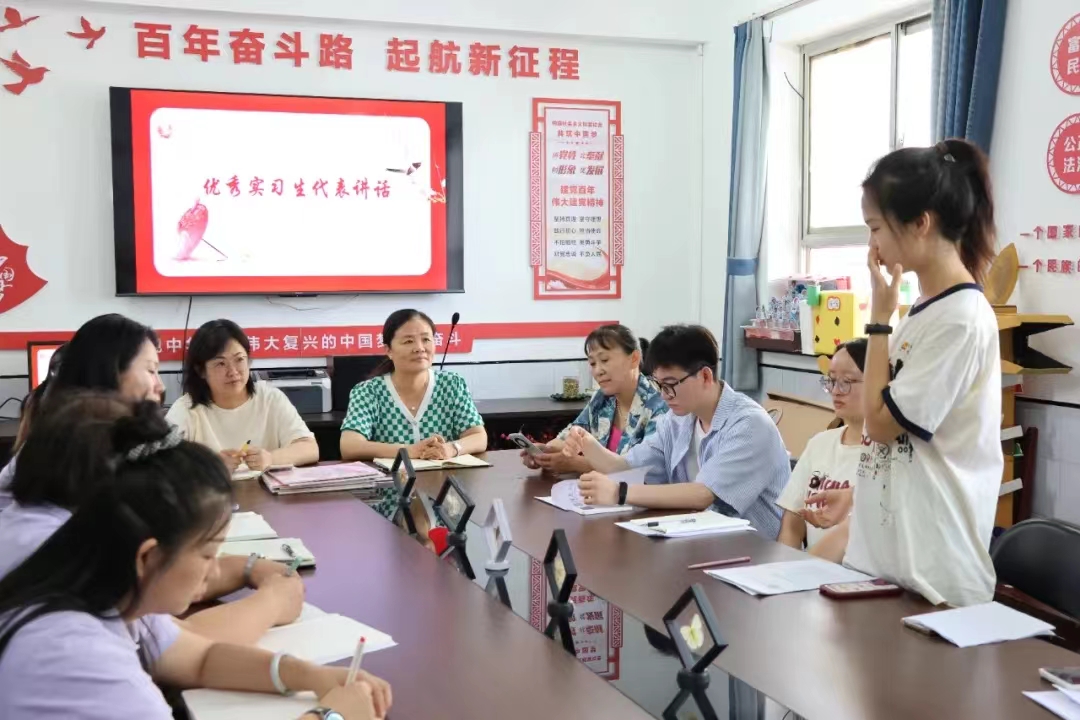 活动中优秀实习生代表发言,杨佳同学回顾了实习期间的点点滴滴,分别从工作收获、实习感想两个方面讲述了自己实习的心路历程,很庆幸遇到一群认真负责的老师以及可爱的孩子。感谢幼儿园提供锻炼机会、向校领导和指导教师给予的照顾表示感激,并送上了美好的祝愿。各位实习生也纷纷向指导教师表达了最真挚的感谢和祝福。
