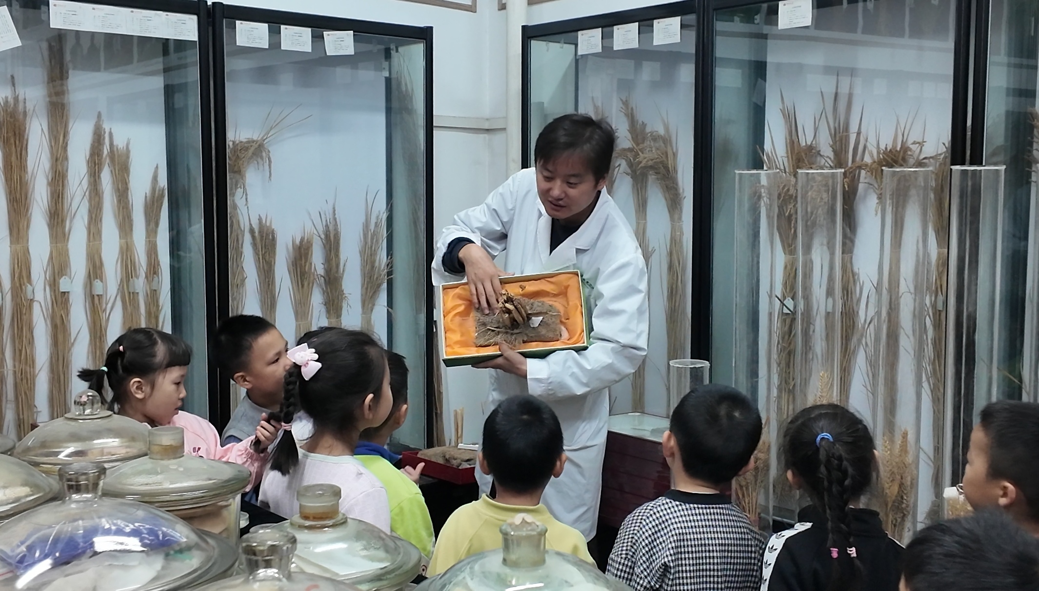 在学院师生引导下,小朋友们首先参观了作物遗传改良与种质创制实验室。科研人员通过趣味讲解和实物展示,向孩子们介绍了水稻、小麦等作物的生命历程和遗传奥秘,并展示了现代生物技术在种质创新中的应用。孩子们好奇地观察实验仪器,亲手触摸水稻样本,感受科技与农业的紧密联系。