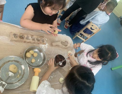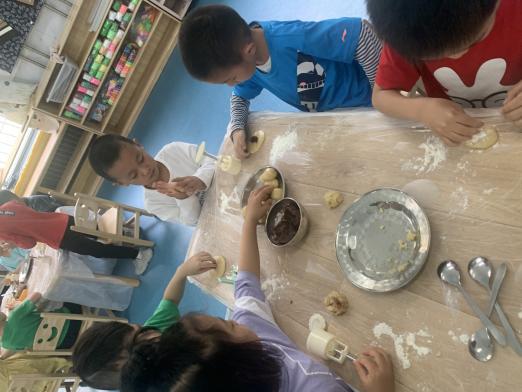 然后在老师的带领下孩子们学习了制作月饼的过程,激发了孩子的兴趣,引导孩子们自己动手制作月饼。香甜的月饼里是期盼、是思念、是团圆,孩子们用小手捏、压、挤出了千姿百态的月饼。