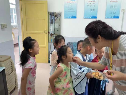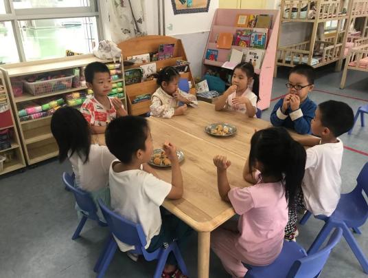 下午在厨房师傅的帮助下孩子们品尝到了自己亲手制作的月饼。并组织大班组的孩子将月饼分享给小班和中班的老师和小弟弟小妹妹们。在品尝中孩子们感受了分享带来的幸福。