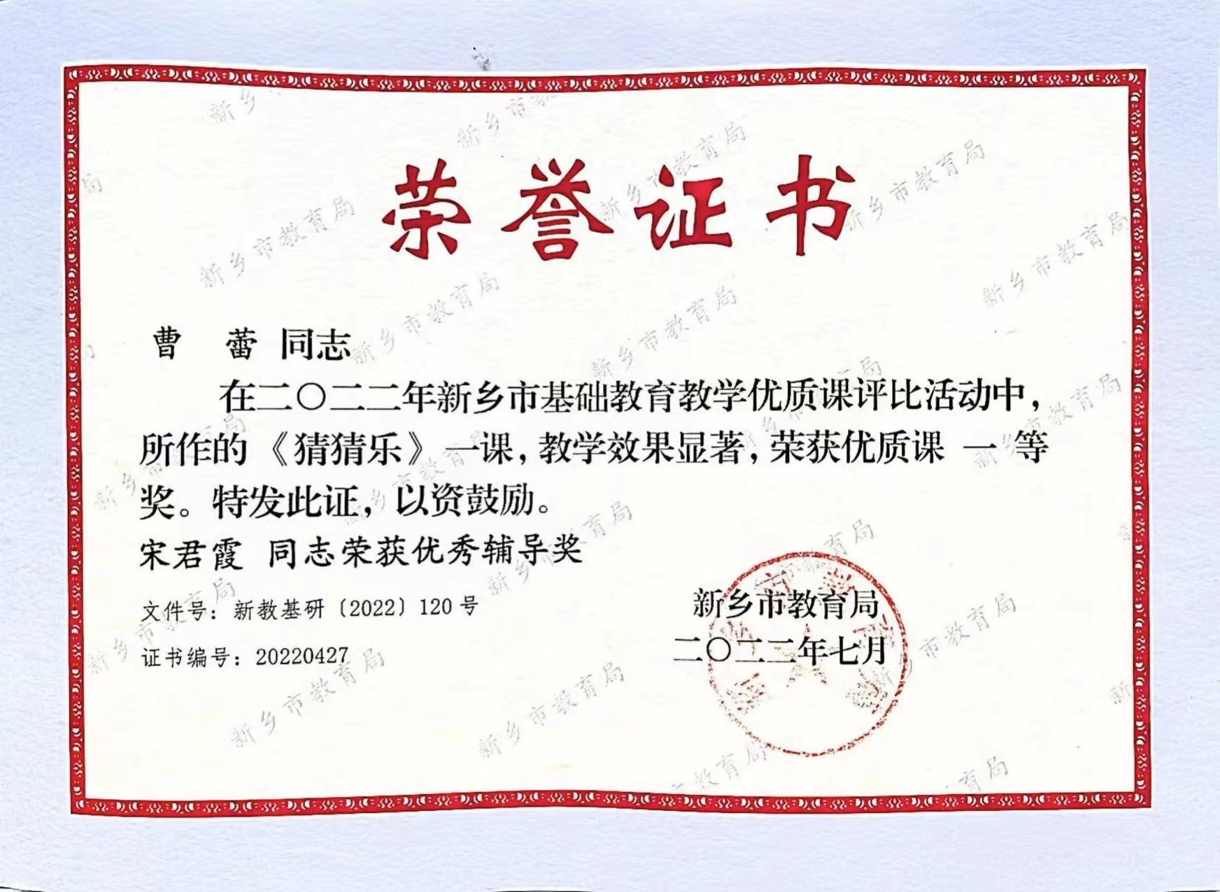 我园教师曹蕾在新乡市基础教育教学优质课评比活动中所做的数学活动《猜猜乐》一课,教学效果显著,荣获优质课评比一等奖。宋君霞荣获优秀辅导奖。