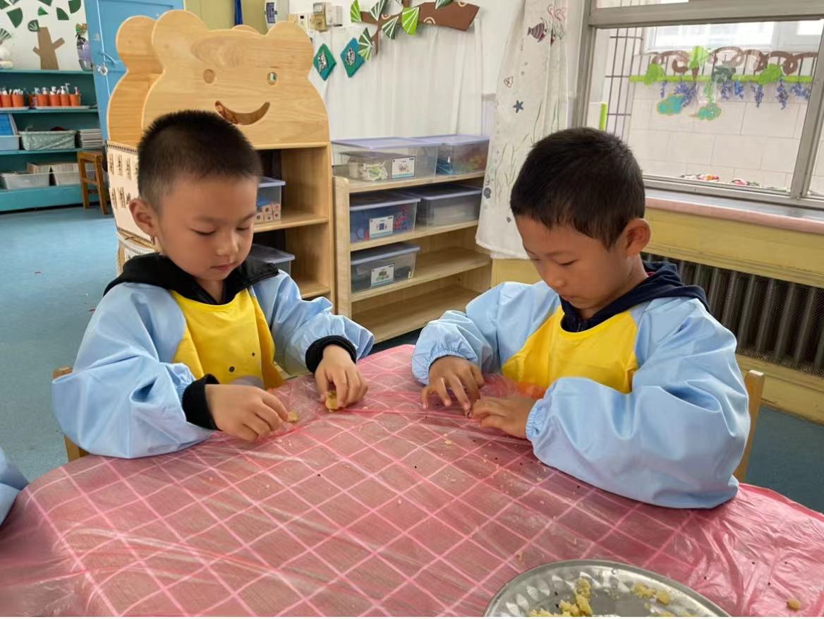 在老师的指导下,小朋友们通过搅拌、揉捏、切割等方法,精心制作桃酥。小朋友将自己制作的桃酥送给爷爷奶奶,为他们送上重阳节的祝福。