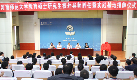 9月12日下午,我校在安阳市第一中学举行教育硕士专业学位研究生校外导师聘任暨教育教学实践基地揭牌仪式。安阳市教育局黄锋一局长等有关领导,我校校长助理吴益民、研究生学院有关负责人、参加实践的教育硕士及其导师,安阳一中有关校领导及全体教师参加了仪式。仪式由安阳一中书记戴志良主持。