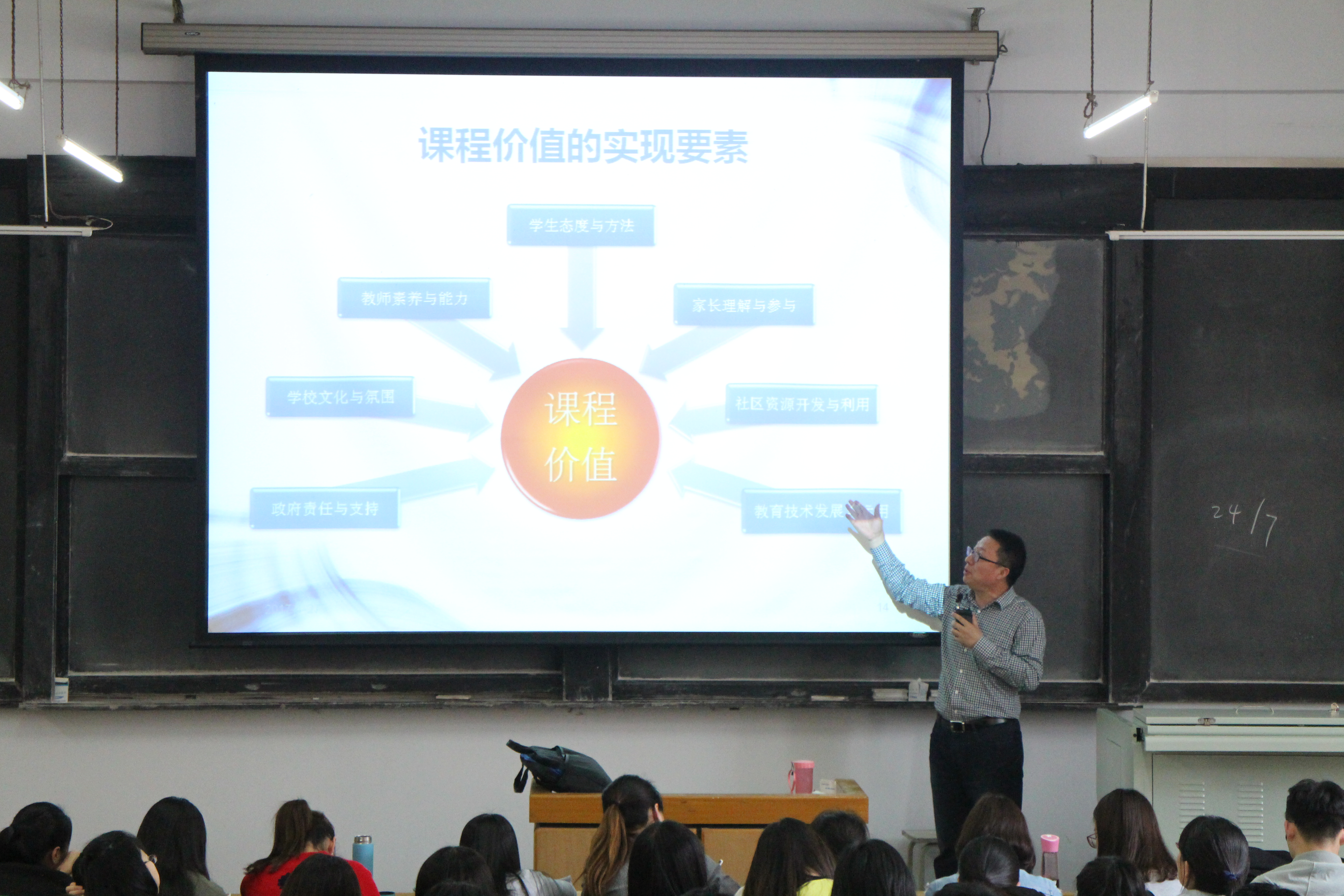 徐万山老师作了题为“教师课程力与课程价值的实现”的学术报告,他从课程价值及其实现因素、教师课程力的构成及影响、教师课程力的关键与提升等方面深入浅出地讲解了在新的时代背景下课程价值所蕴涵的核心理念以及教师实现课程价值、提升课程力的方法。他通过展示若干优秀教师和学校的教学实例,给在座的老师和学生以很大的启发与触动。同时,徐老师鼓励教师在教学过程中要以学生为本,通过学生了解教师自己,不断改善教学方法、提升教师课程力。最后,梁院长总结了此次讲座的主要内容并对徐秘书长此次来我校讲学表示真诚的谢意,同时鼓励我校研究生到示范中小学进行调研,做好教学的实践与反思工作,最终推动中国教育事业的革新与发展。