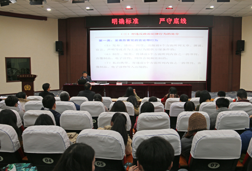 为深入学习贯彻党的十九大精神,加强理想信念教育,提高党性修养,推动研究生党员学习贯彻《中国共产党廉洁自律准则》和《中国共产党纪律处分条例》的自觉性,12月7日晚,校纪委书记张尚字在西区物理北楼学术报告厅为研究生党员作了一场题为“明确标准 严守底线”的《准则》《条例》学习辅导报告。各学院研究生工作秘书、辅导员、党员代表等400余人聆听了报告。报告会由党委研工部部长杜晓田主持。