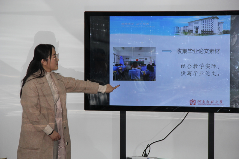 在这样的理念激励下,6个学科专业实习生代表分别从不同的角度,对为期两个半月的实习情况进行了PPT汇报。学科教学(英语)的赵健慧从学习概况与内容、收获与感悟等几个方面,深刻的表达了自己对新乡一中的由衷崇拜,对导师的关怀与帮助表示万分感谢。政治与公共管理学院的李明同学说:我通过在新乡一中的学习,对讲课不再胆怯、对论文不再头疼、对工作不再发愁。同时,导师们对我校实习生在新乡一中的表现和积极的学习态度给予肯定,对他们在实践中展示的好学精神大加赞赏。