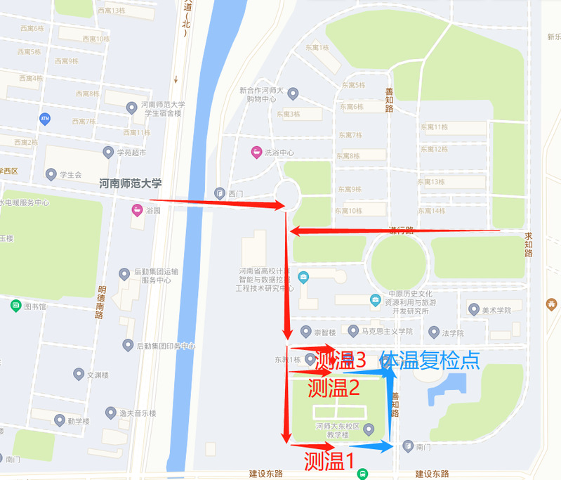 (说明:图中东校区教学楼为文昌楼,东教1楼为求是西楼,体温复检点在求是中楼。红色箭头路线为进场路线,蓝色箭头路线为体温异常考试至体温复检点专业通道路线。)
