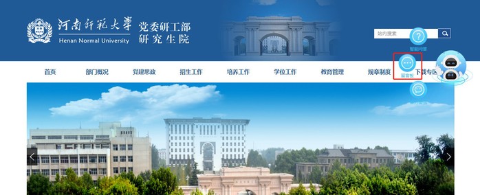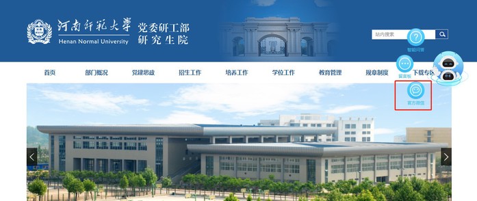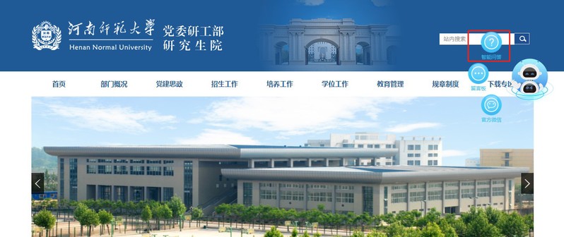 点击访问伟德官网下载苹果版研究生院网站(//www.ldvrms.com/yjsxy/),如下图所示访问学校官方网站,点击招生问答功能。