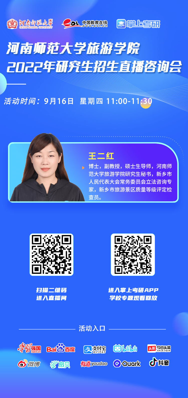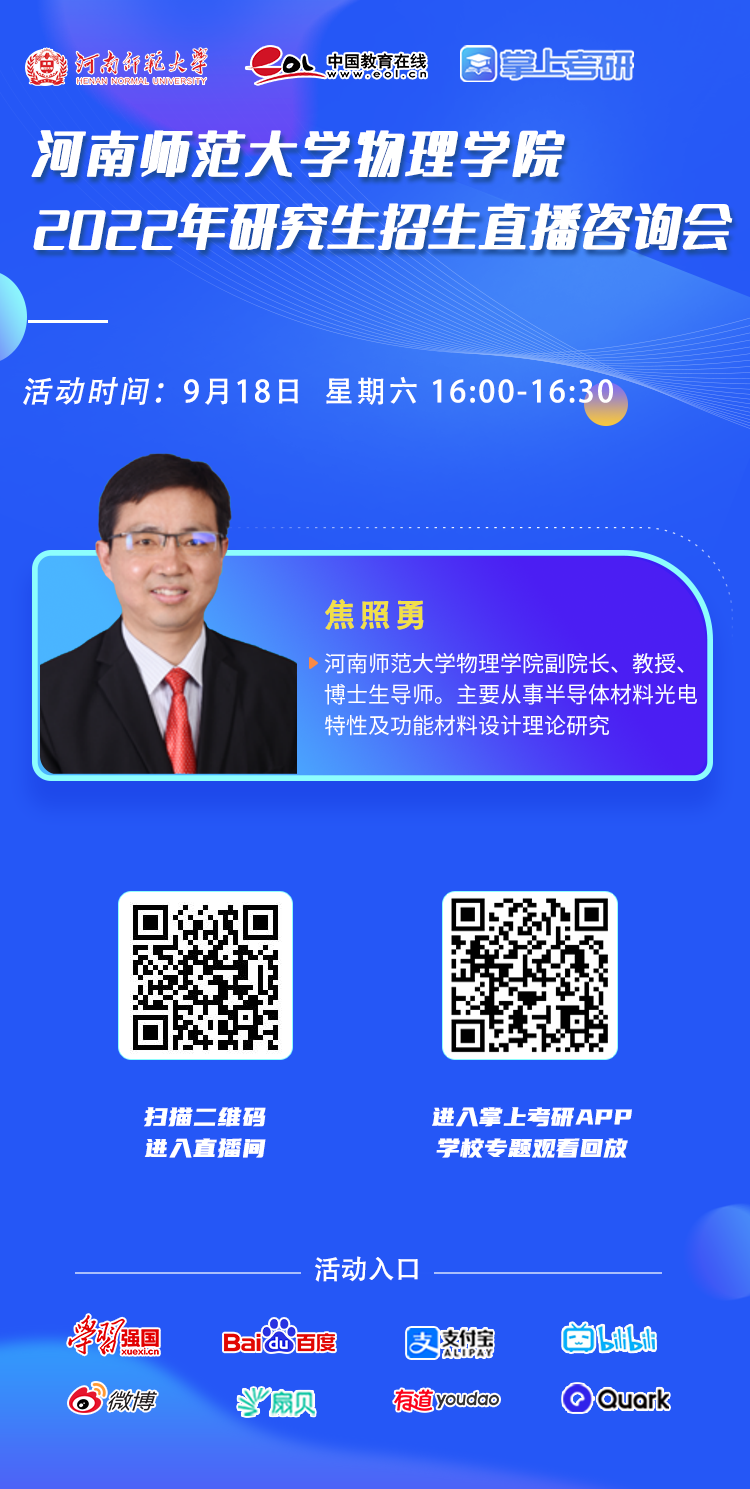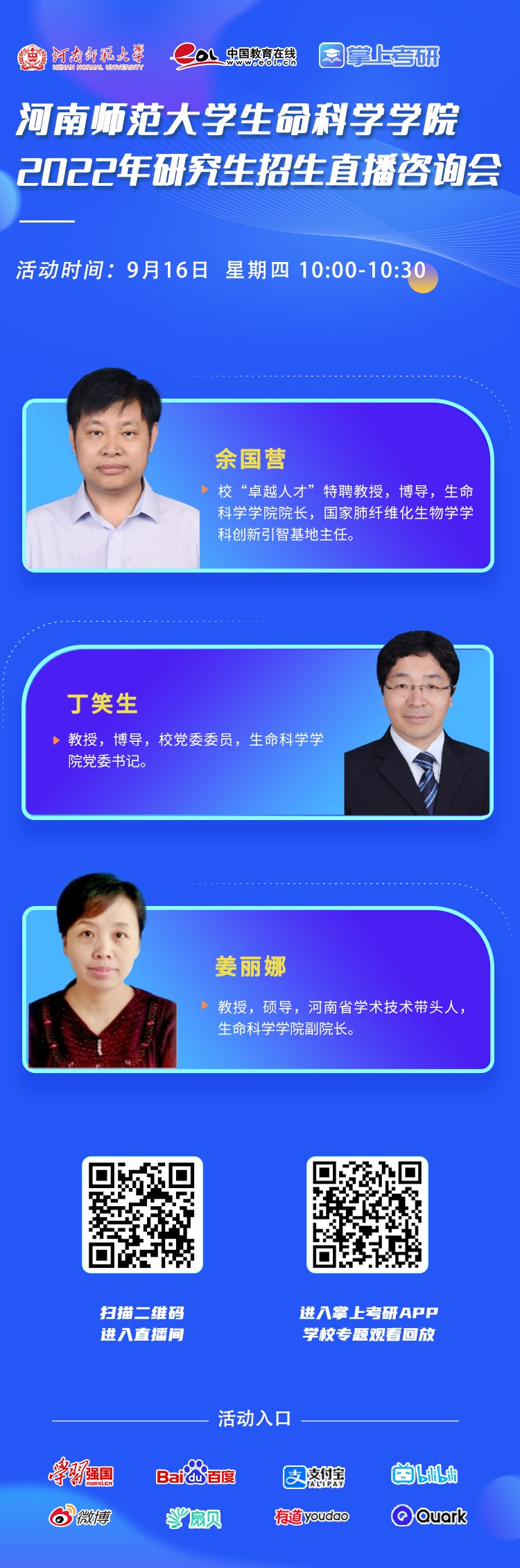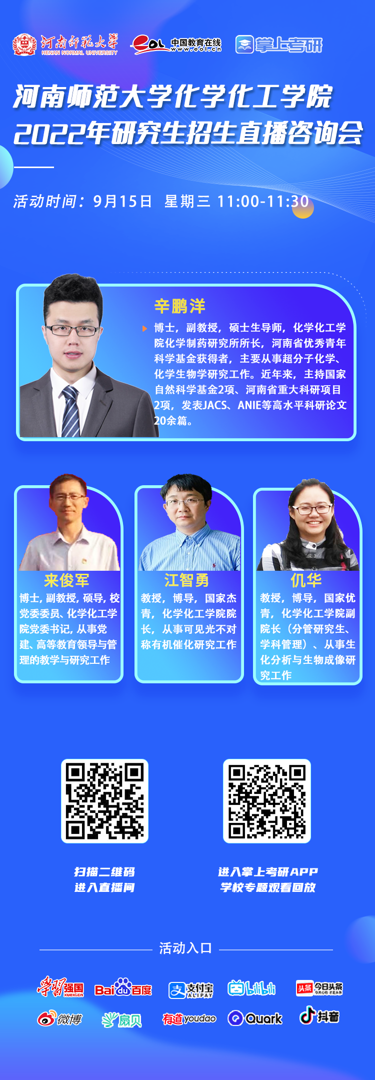 本次招生宣讲活动会在中国教育在线考研频道、掌上考研app、学习强国、网易有道、扇贝等同步上线,在支付宝校园频道、微博、B站等均可以观看直播回放,敬请关注!