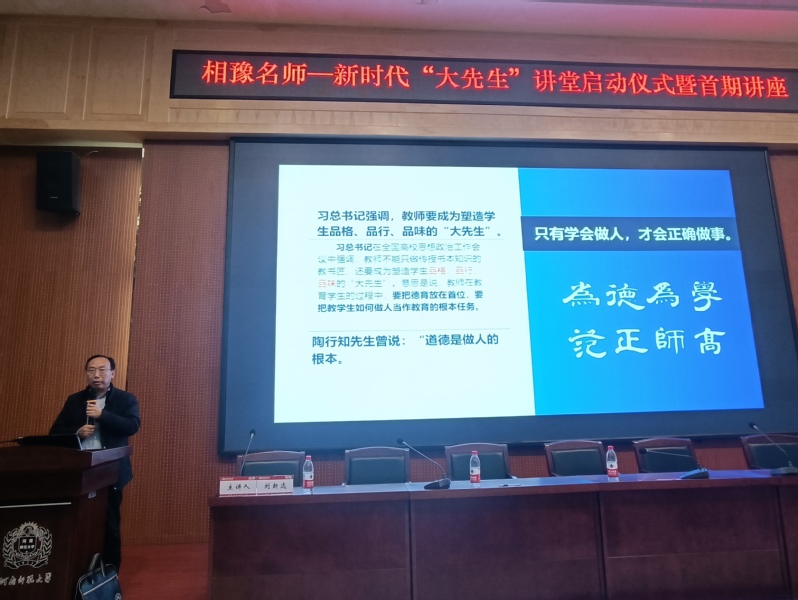 启动仪式后,国家“万人计划”教学名师、中原名师、河南师大附中双语国际学校副校长刘新选作《新时代“大先生”:师•德•能•行》的专题报告。刘新选老师从“师、德、能、行”四个方面分享了修为有“品格、品行、品位”的新时代“大先生”特征,以自己的教育实践激励师范生和青年教师要以立德树人为根本,坚定理想信念,以育人能力为核心,深研教育理论,深耕教育实践。