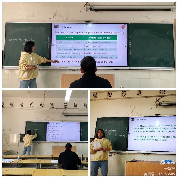 从来学校到现在已经有两周的时间,学习了不同老师的授课优点和特点,认识到自己在学校学习书本理论知识和实际中的教学有一定的差距,需要不断提高。何老师的课堂时时导入有关中国文化的知识,供学生们学习,既能帮助学生学习英语,又有助于学生用英语了解和讲解中国故事,培养学生的文化意识,家国情怀,紧贴高中英语新课标中的核心素养。蔡老师的课主要是高三平时的习题讲解,其中作文部分,蔡老师擅长将作文结构拆分讲解,并引入时事热点,条理清晰,非常有趣且实用。王老师善于营造课堂气氛,学生积极且乐于参与。三位老师各有自己的风格和特色,在之后的实习生活中我需要更全面的参与且了解教学工作的各个环节,多与老师交流自己的想法,让自己的教学设计与教学能力更上一层楼。
