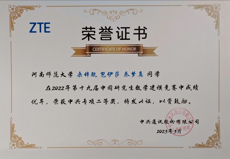 经过党委研究生工作部、研究生院、研究生数学建模中心的认真组织筹备,在指导教师的悉心指导下,我校参赛研究生全心全力投入,参赛队伍取得了一等奖1项(中兴专项二等奖)、二等奖5项、三等奖10项,共计16项国家奖的好成绩,获奖队伍的数量和质量均创我校参赛以来的新高。由数学与信息科学学院高清慧老师指导的桑梓航、包伊莎、秦梦真的三人团队获得中兴专项第五名,入选全国一等奖和中兴专项奖二等奖。