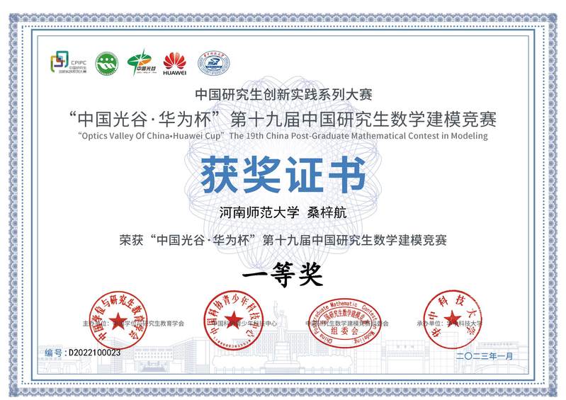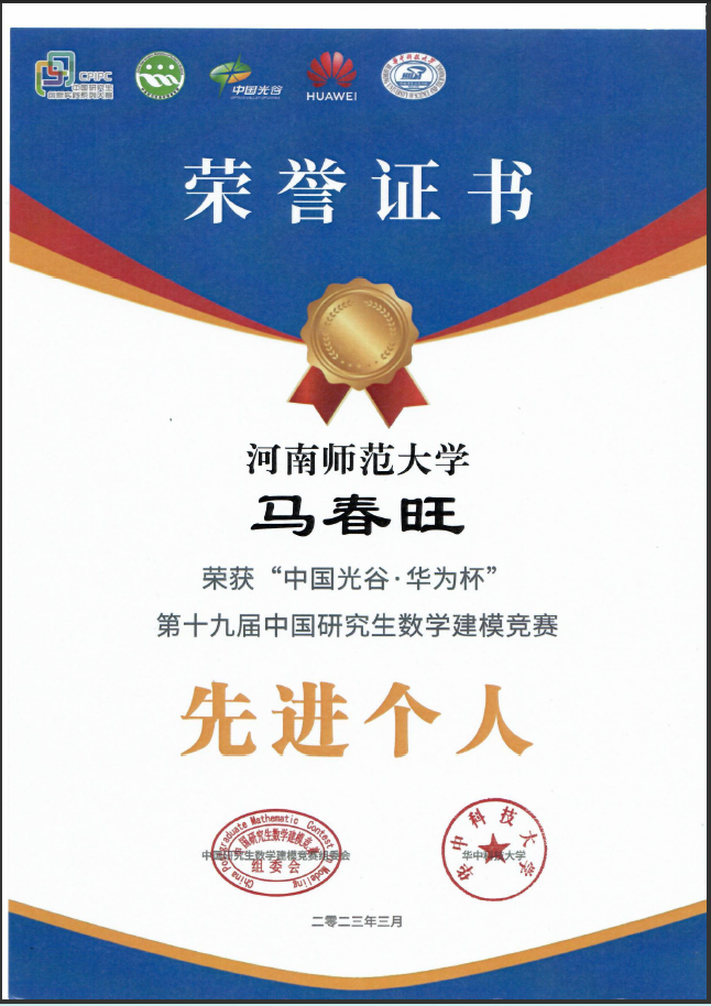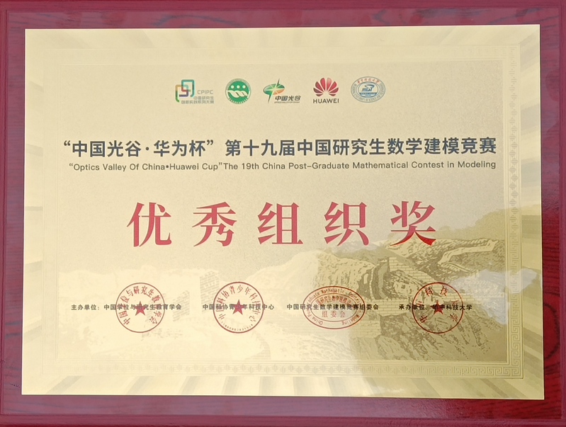 另外,由于竞赛组织工作和获奖成效突出,我校获得“第十九届中国研究生数学建模竞赛优秀组织奖”(本届比赛全国共有465所高校参赛,共53所高校获评优秀组织奖),马春旺获得“第十九届中国研究生数学建模竞赛先进个人”的荣誉称号。