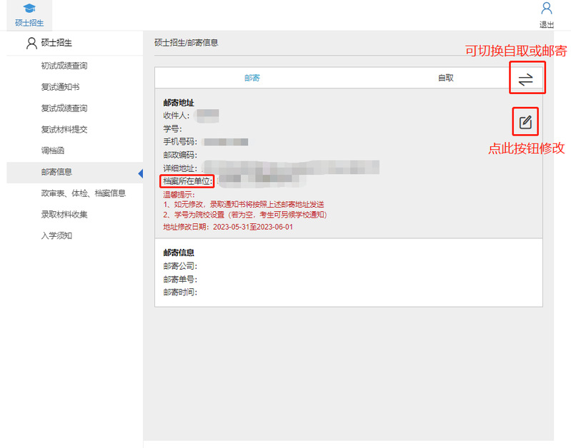 为保证后续工作的顺利进行,我校开通了研究生管理系统的档案管理部门和通知书邮寄地址变更的功能模块。请需要修改档案管理部门、通知书邮寄地址及联系电话的考生69日前完成修改提交工作操作流程。逾期未确认的,将按照网上报名时填写的相关内容进行调档函的制作和通知书邮寄工作。