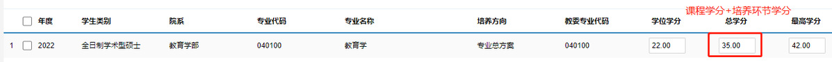 制定培养方案时,方案列表中的“总学分”、方案内<基本信息>文字描述的最低学分、方案内<课程设置>表格中“至少修X分”与培养环节学分之和三者要保持一致(见下图)。