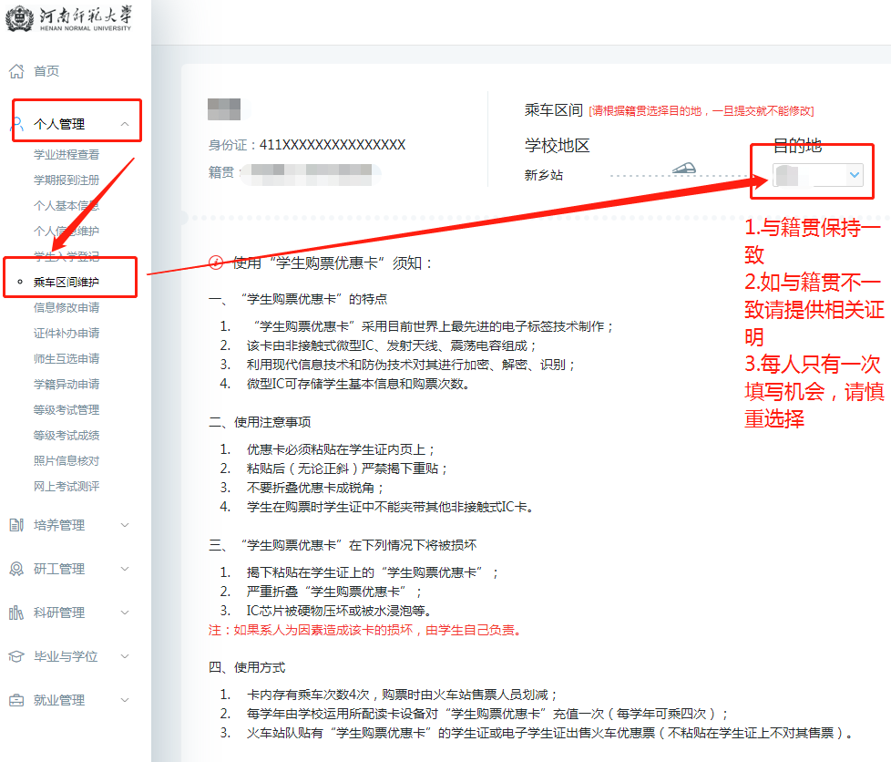 研究生新生在研究生信息管理系统中提交乘车区间,具体操作步骤如下图: