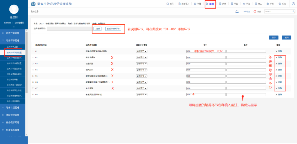 3.培养环节学分设置系统路径为:培养/培养环节管理/培养环节学分设置,根据不同的“学生类别”设置相应培养环节的学分,同时也可根据实际情况在“备注”一栏更改培养环节名称学生成绩单上将会优先显示备注的培养环节名称。务必将不需要的环节删除。(下图以“硕师计划硕士”为例。)