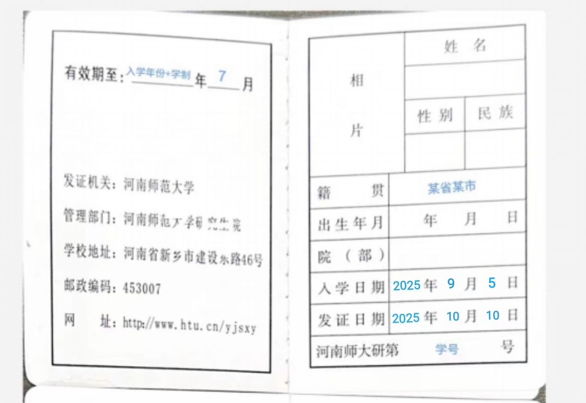 1.各学院指定负责人于10月13日根据实际报到研究生人数统一签领空白研究生证,领取研究生证时请递交《XX学院办理研究生证名单》纸质版(见附件,名单需按照学号排序),电子版同步至邮箱hnsdygb@htu.cn。研究生证一人一本,如无印刷问题不提供更换,请认真填写各项信息,要求字迹工整,不得涂改。