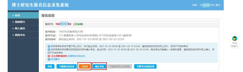 (1)使用学信网帐号登录博士报名系统,成功登陆后界面如下图所示:
