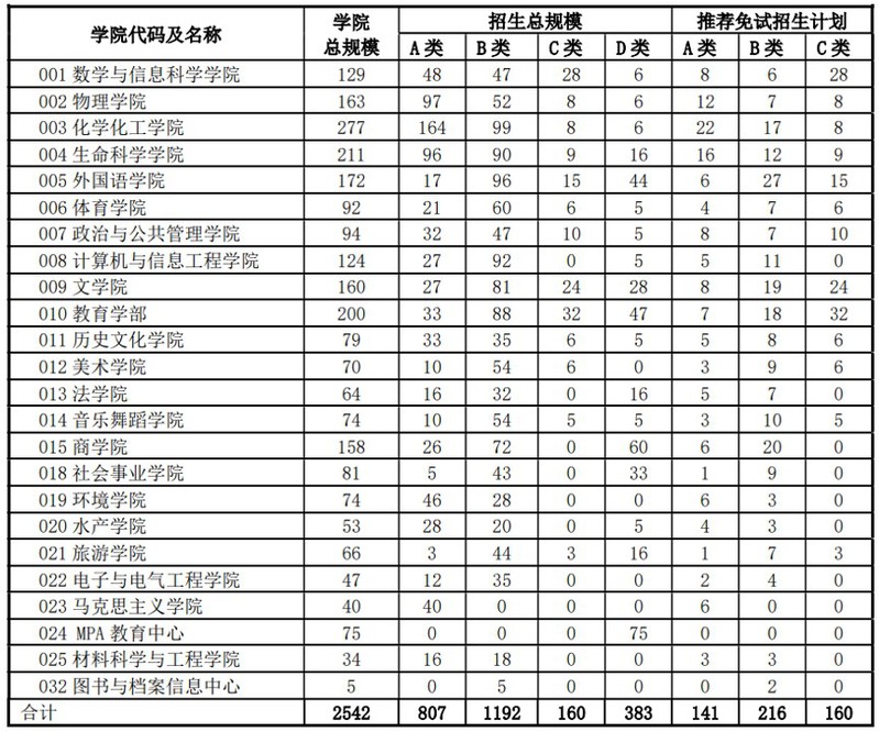 为了分类管理招生计划,我校将研究生招生分为四类,即全日制学术学位(A类)、全日制专业学位(B类)【不包含农村师资教育硕士计划(以下简称硕师计划)】、硕师计划(C类)、非全日制专业学位(D类)。招生计划按学院(部)分类别进行分配,而不细分到各专业(领域),复试录取时根据国家下达计划、合格生源、师资等情况由各学院(部)公布分专业(领域)招生计划。各学院(部)拟招生计划见表1,总规模中包括推荐免试招生计划,推免录取结束后(预计在2022年10月底前)在研究生院网站公布实际录取名额。推荐免试中A类、B类为预计招生数,C类按所列计划招生。