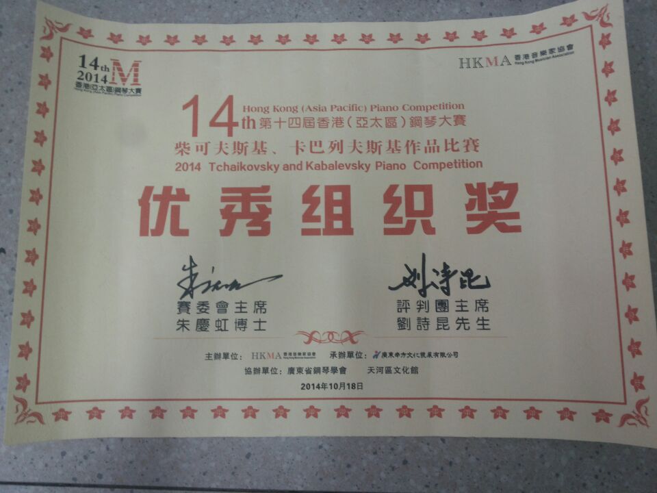 2014年10月初,“施坦威钢琴” 2014第五届亚洲青少年钢琴艺术节暨“舒曼艺术奖”国际青少年钢琴公开赛总决赛在香港举行,本次大赛由中国钢琴艺术研究会主办,香港国际文化艺术交流中心承办。
